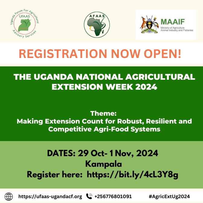 It is against that background, that a National Agricultural Extension Week in Uganda (UGNAEW 2024) has been organized under the theme: “Making extension count for robust, resilient and competitive agri-food systems”. The UGNAEW2024 will take place from 28th October – 01st November 2024, at Silver Springs Hotel, Bugolobi, Kampala. This will be preceded by regional level workshops.