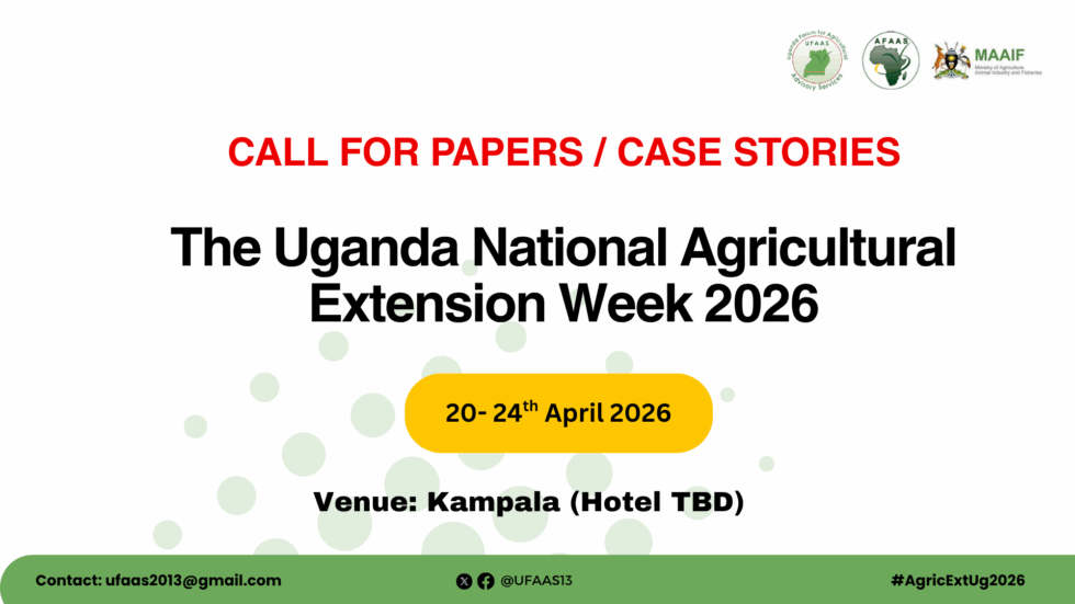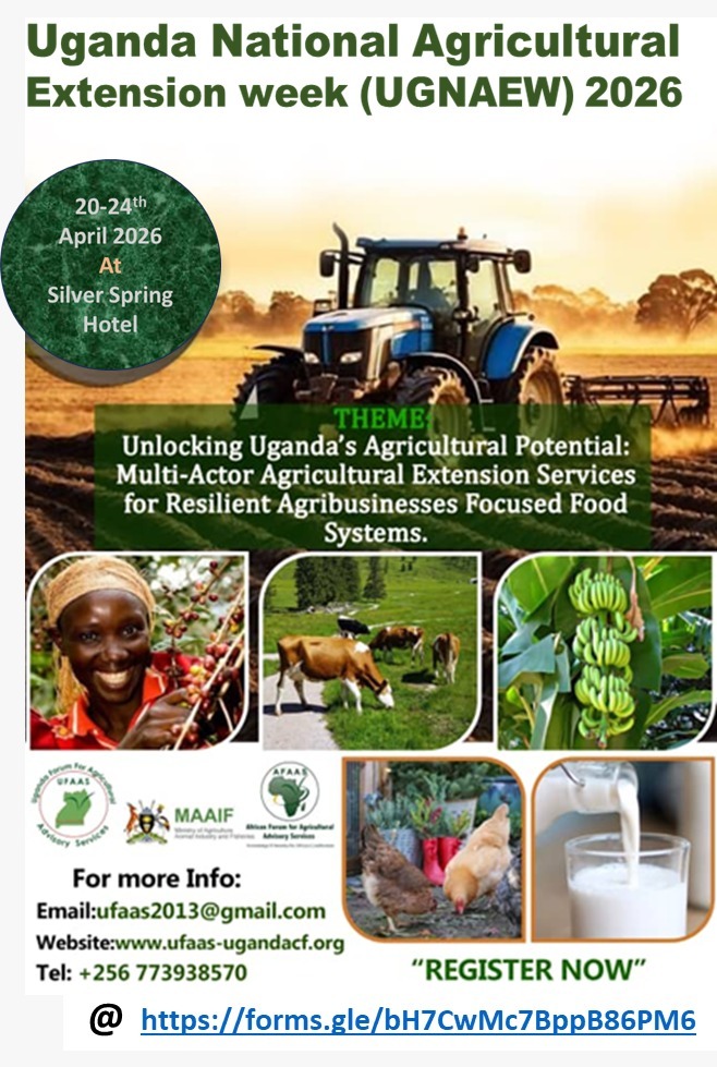 The Uganda National Agricultural Extension Week 2026 (UGNAEW2026) will be held from 20-24 April 2026 at Silver Springs Hotel, Bugolobi, Kampala, under the theme “Multi-actor agricultural extension and advisory services for resilient, digital and market-oriented food systems”. This event will be preceded by regional workshops and agricultural-related events. The event is organised by the Uganda Forum for Agricultural Advisory Services (UFAAS), in partnership with the African Forum for Agricultural Advisory Services (AFAAS), the Ministry of Agriculture, Animal Industry and Fisheries (MAAIF), and other partners.