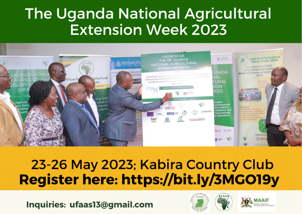 The Uganda National Agricultural Extension Week 2026 (UGNAEW2026) will be held from 20-24 April 2026 at Silver Springs Hotel, Bugolobi, Kampala, under the theme “Multi-actor agricultural extension and advisory services for resilient, digital and market-oriented food systems”. This event will be preceded by regional workshops and agricultural-related events. The event is organised by the Uganda Forum for Agricultural Advisory Services (UFAAS), in partnership with the African Forum for Agricultural Advisory Services (AFAAS), the Ministry of Agriculture, Animal Industry and Fisheries (MAAIF), and other partners.